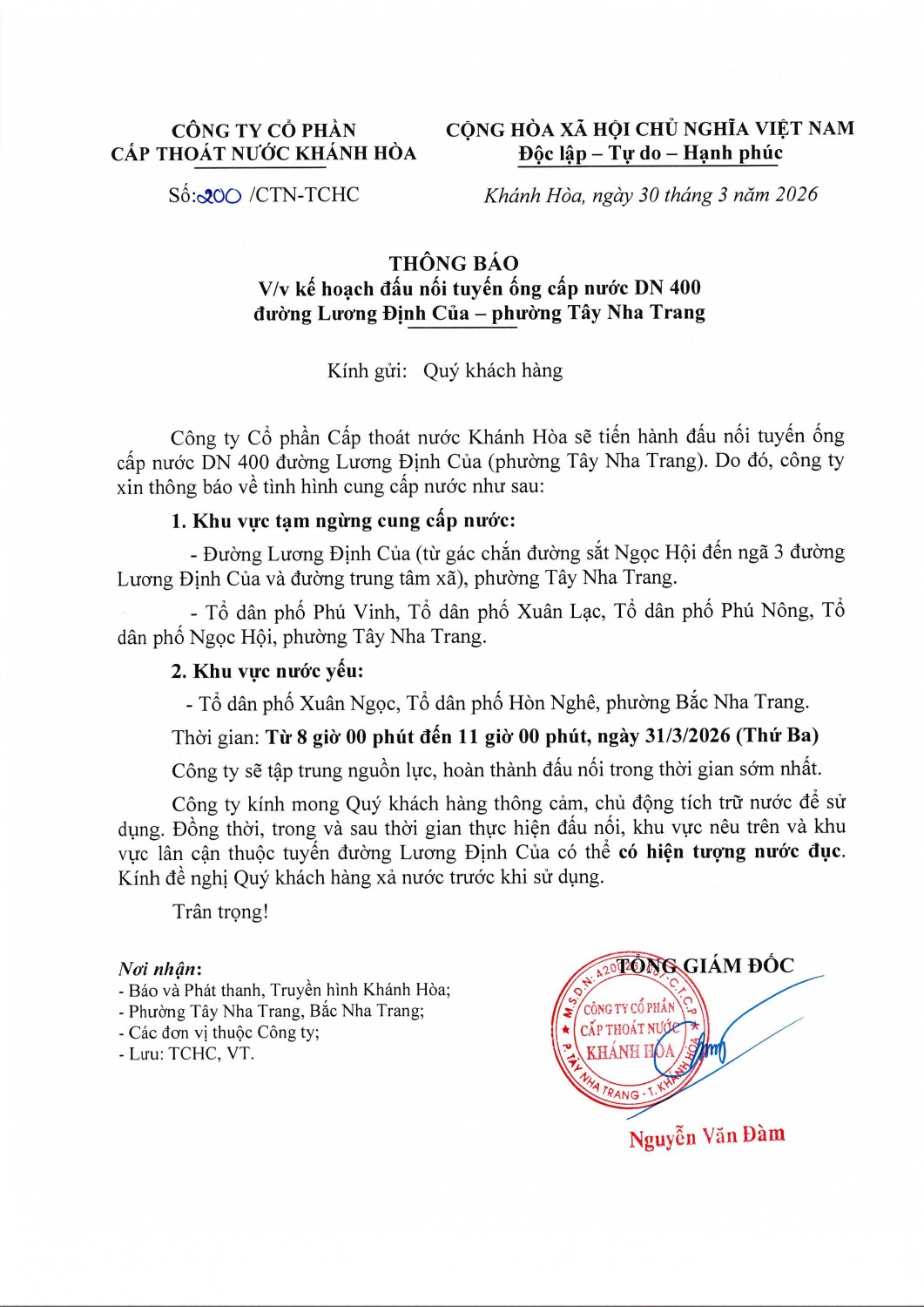 Thông báo kế hoạch đấu nối tuyến ống cấp nước DN 400 đường Lương Đình Của - Phường Tây Nha Trang Chia sẻ