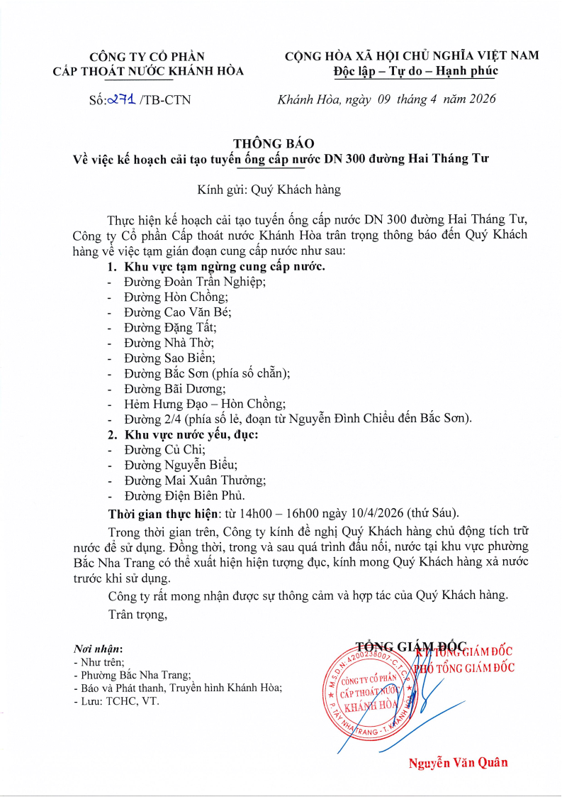 Thông báo V/v kế hoạch cải tạo tuyến ống cấp nước DN 300 đường Hai Tháng Tư