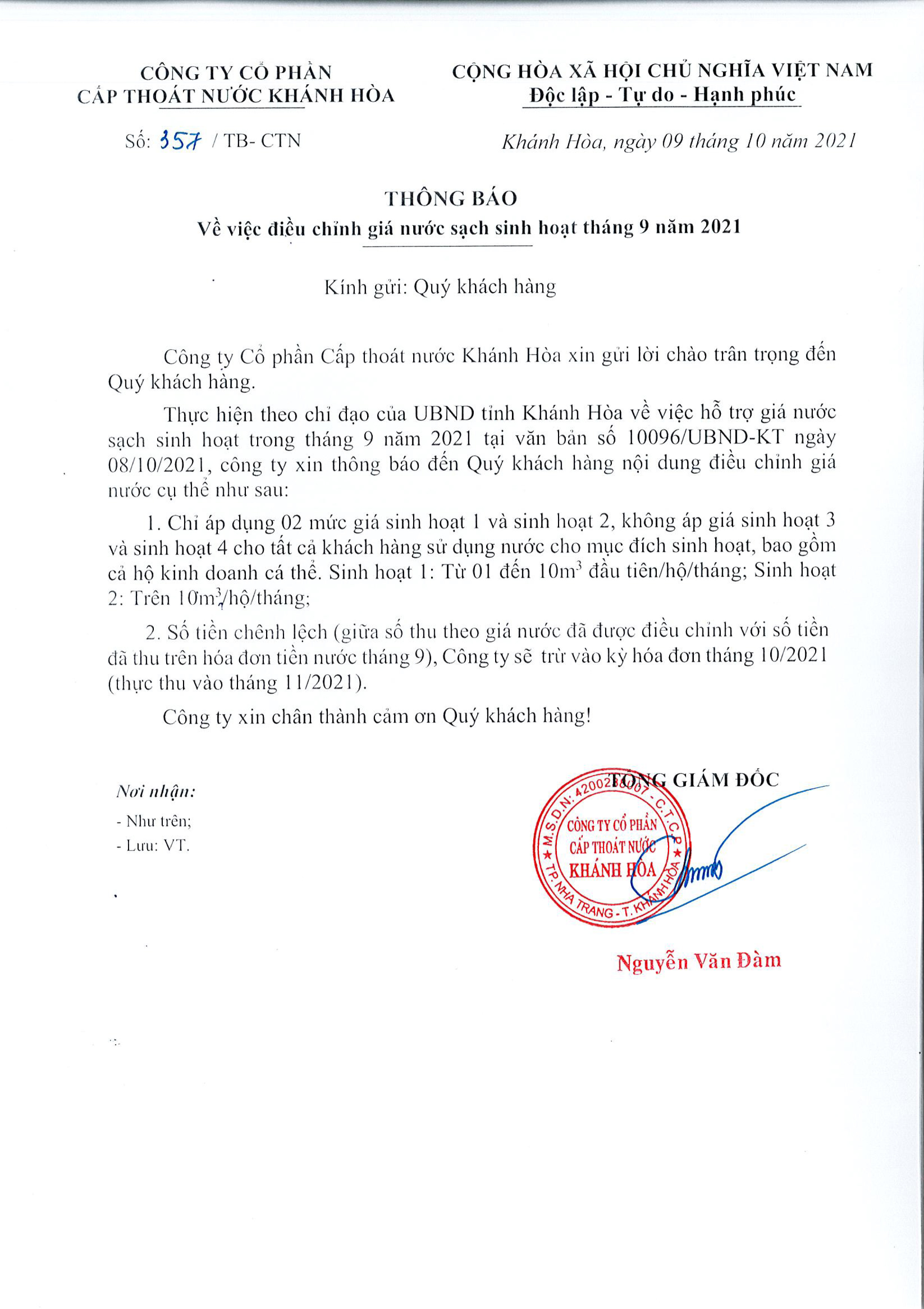 📄 Thông báo về việc điều chỉnh giá nước sạch sinh hoạt tháng 9 năm 2021
